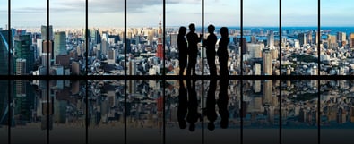 Business meeting in a modern glass-walled office with blurred pedestrian motion