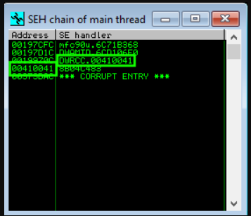 Looking at this process in a debugger, it becomes clear what is happening. The input is being written to the stack and has overflown the SEH addresses. This is quickly visible by looking at the SEH chain in the debugger.