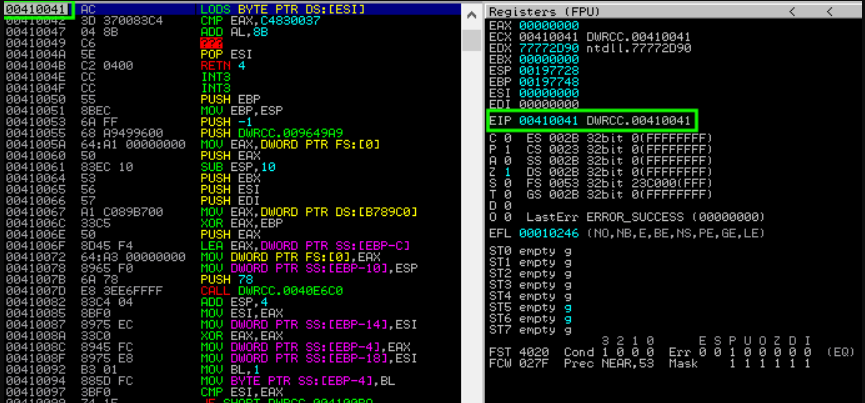 Following this process through, eventually we can see our A’s (0x41) being placed into EIP due to the corrupted SEH chain.