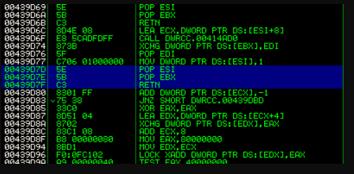 By placing a breakpoint on the first address of our “POP, POP, RET” instruction set, we can pause execution to step through and check everything is working as intended.
