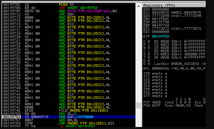The next step is to overwrite the SEH and next SEH addresses with the address of the instruction found above and the op codes for a small jump over that address. Once executed, the execution flow should be then directed into the area of memory on the stack under our control. For both the address and the jump, UTF-16 characters were used so to avoid the null bytes. The payload looks like this at this point (most of the ‘A’s have been cropped for readability).